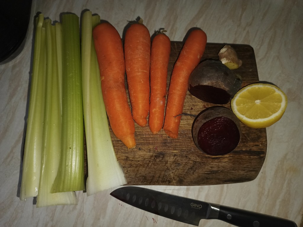 Again, I used celery, beetroot, carrots, ginger and lemon. I made enough for two and changed up the quantities to yesterday.