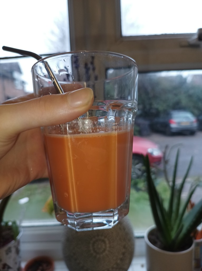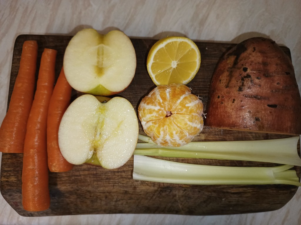 After my bath I made a juice with my partner, this morning we used carrots, sweet potato, apple, oranges, lemon, celery.