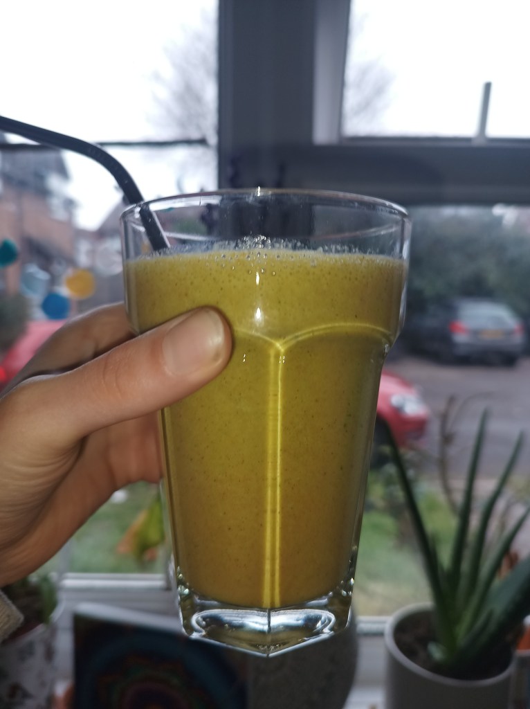 I also made a smoothie good for acid reflux, this had pea milk, aloe vera gel (I got this from my aloe plant), bananas, turmeric, ginger, cinnamon, manuka honey, fresh basil leaves.